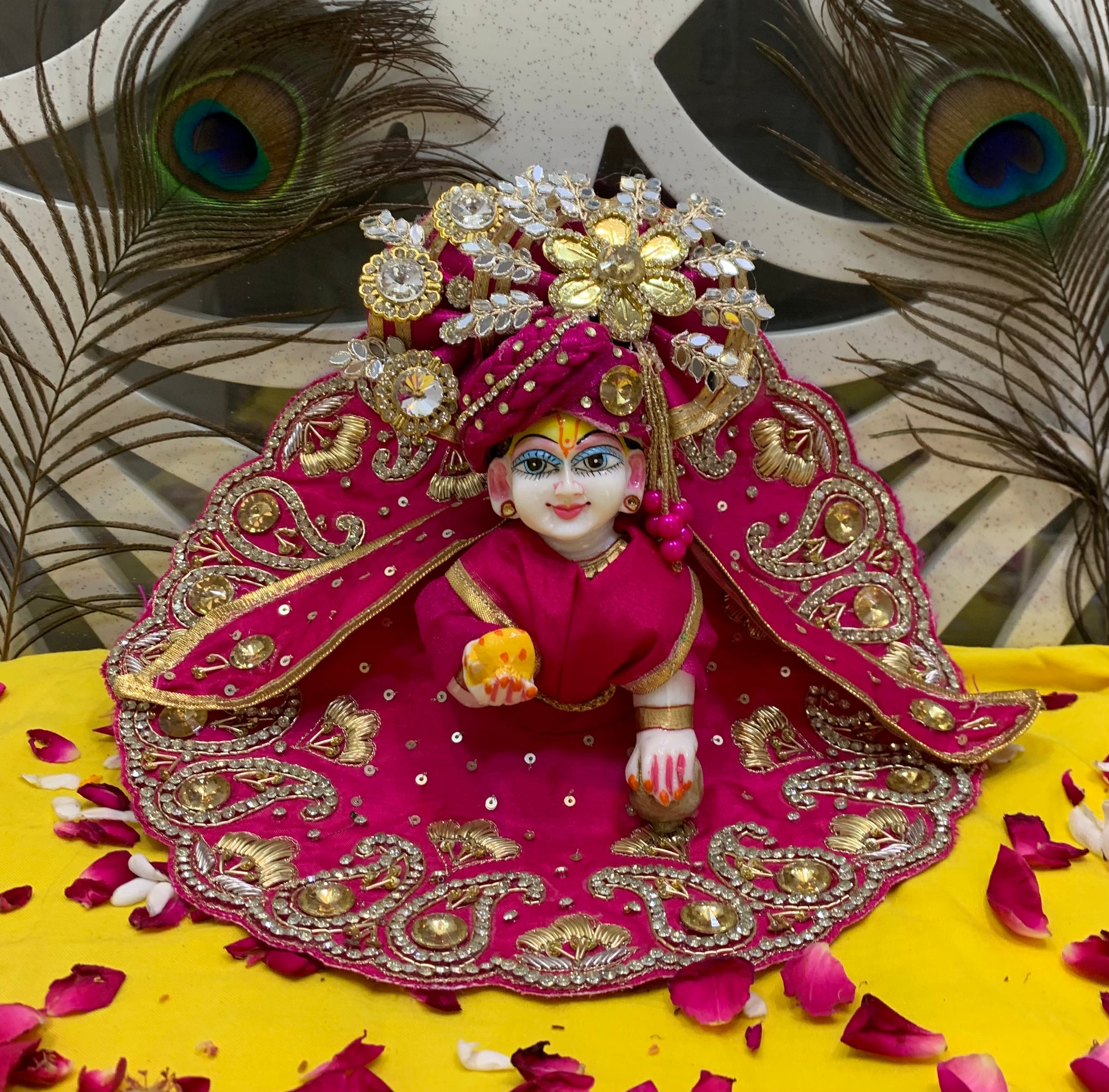 Bring royal elegance to your Laddu Gopal with this stunning pink dress set adorned with intricate golden embroidery and shimmering stone work. Crafted with devotion and designed for beauty, this set includes a pleated lehenga, matching dupatta, designer mukut (crown), and premium jewelry accents.
